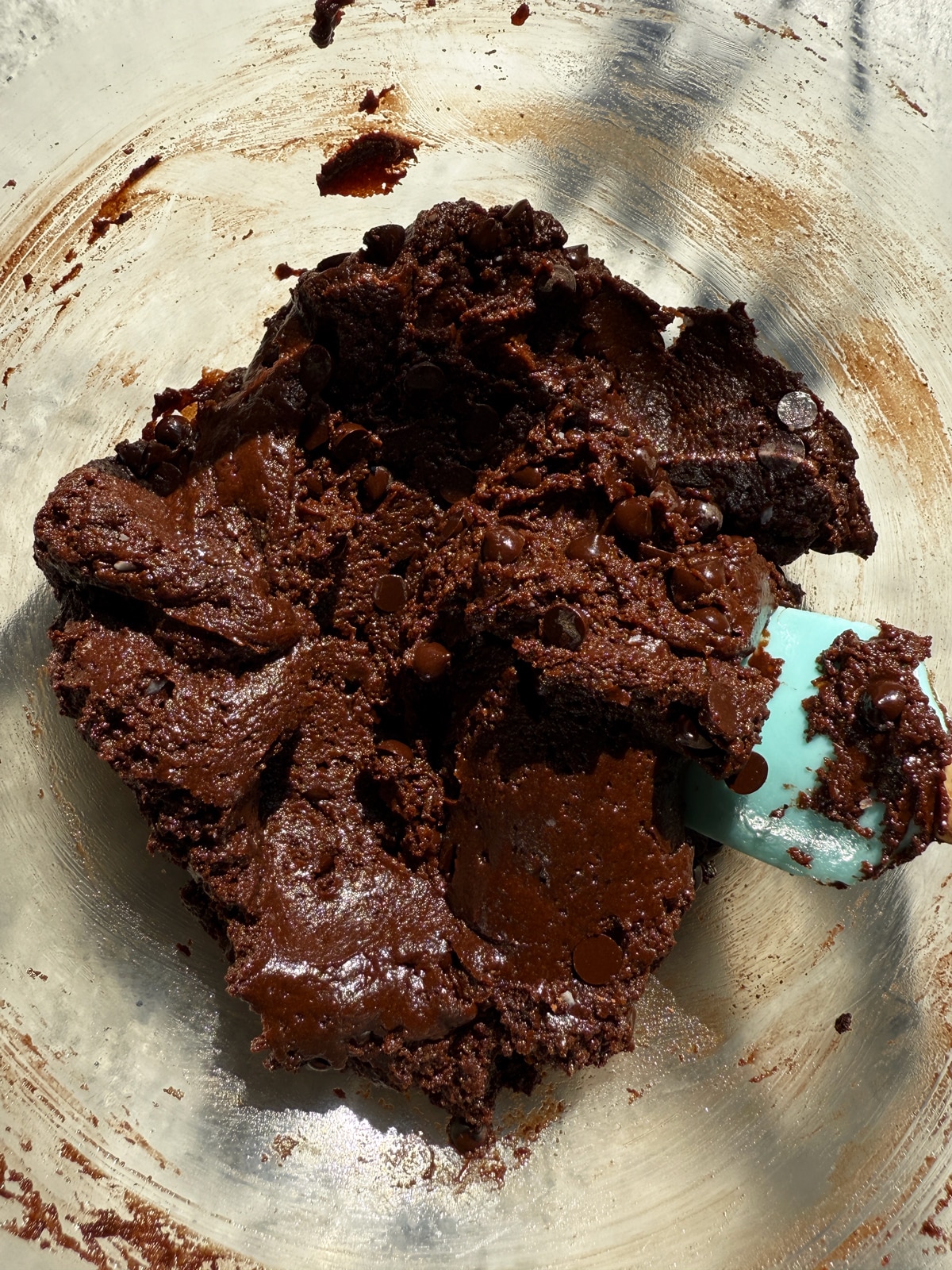 - Mix in the buckwheat flour, cocoa powder, baking soda and salt. Then fold the chocolate chips into the batter.